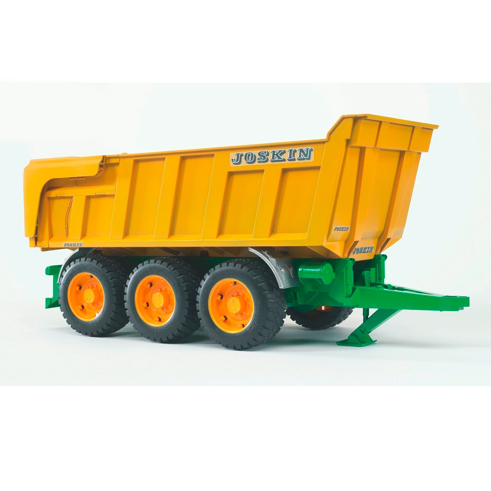 Einer der größten und schwergewichtigsten Wannenkippanhänger auf dem Markt ist der 3-achsige Kipper des belgischen Herstellers Joskin. Konzipiert für schwere Lasten und Transporte unter extremen Bedingungen, wie bei Arbeiten im Tiefbau oder bei landwirtschaftlichen Nutzungen in schwierigem Gelände fassen diese "Ungetüme" im Original bis zu 24 Tonnen Nutzlast bzw. bis zu 29 Kubikmeter Ladevolumen. Das eindrucksvolle BRUDER Modell wurde in Analogie zur Original-Baureihe "Trans-SPACE" entwickelt und verfügt entsprechend unserem Slogan..."just like the real thing"... über eine hochklappbare und arretierbare Kippmulde mit automatischer Heckklappenöffnung. Das 3-achsige Fahrwerk gleicht alle Geländeunebenheiten aus. Ideal passt dieser Kippanhänger zu den Top Profi-Traktoren der Neuen Generation, die seit Herbst 2004 erhältlich sind und bereits viele begeisterte Kunden gefunden haben. Aber auch die Traktoren der Profi-Serie sowie unsere Unimogs ( mittels Kupplungsadapter ) eignen sich gut als Zugfahrzeuge.