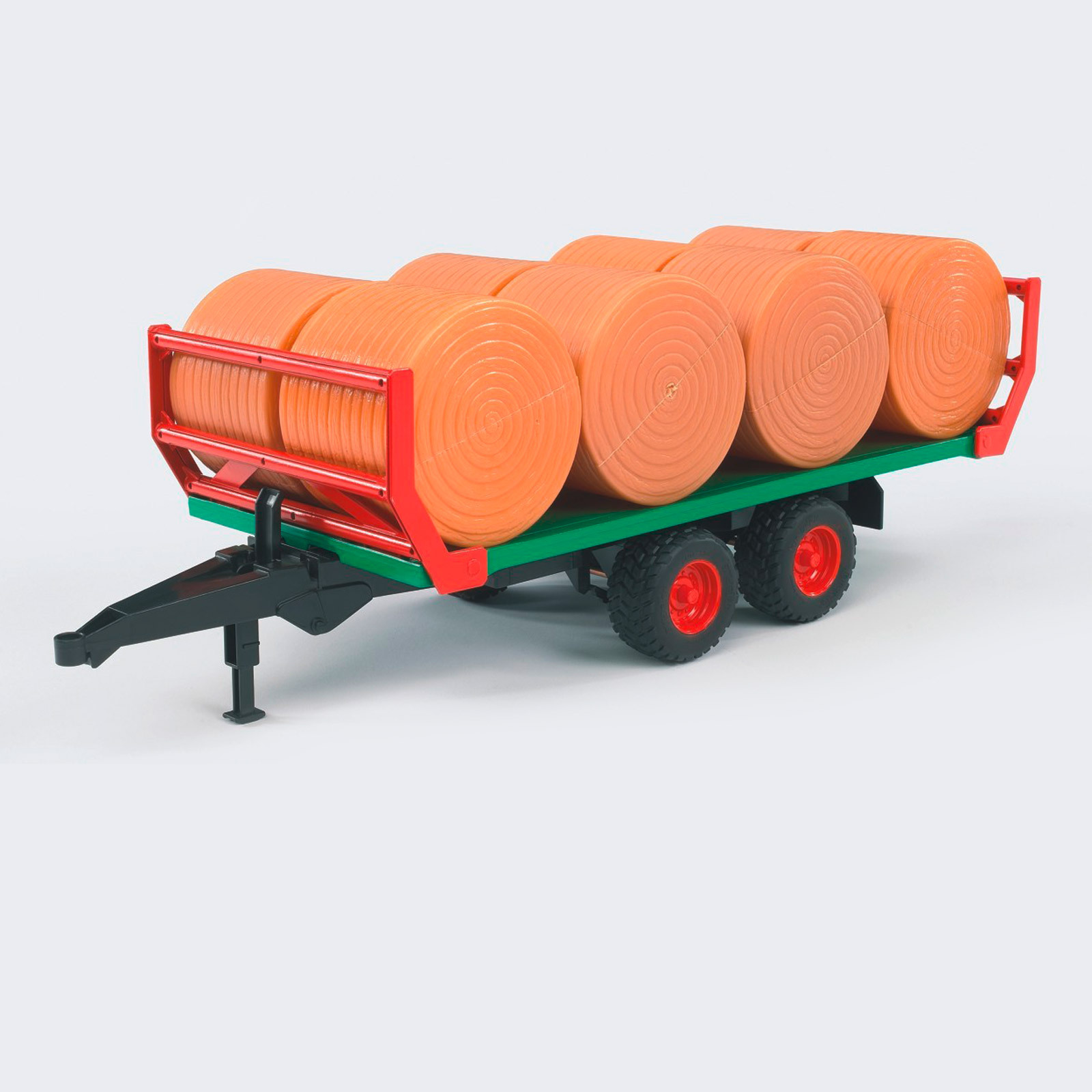 Die im Herbst vielfach auf den Feldern zu sehenden Silage- und Strohrundballen müssen rationell vom Bauern vom Feld in den Stall oder in die Scheune gebracht werden. Zu diesem Transport dient normalerweise ein spezieller Transportanhänger, den es ab jetzt auch im Sortiment von BRUDER gibt. Unser Modell zeichnet sich durch klappbare Begrenzungs-Rungen aus und wird mit 8 Rundballen ausgeliefert. Zur Beladung des Anhängers können alle unsere Traktoren mit Frontlader und Gabelaufsatz benützt werden, wodurch sich ein funktionelles Spielset ergibt. Hervorragend kombinierbar zu dieser Spielidee sind auch unsere Rundballen- und Quaderballenpresse sowie der Rundballenwickler.