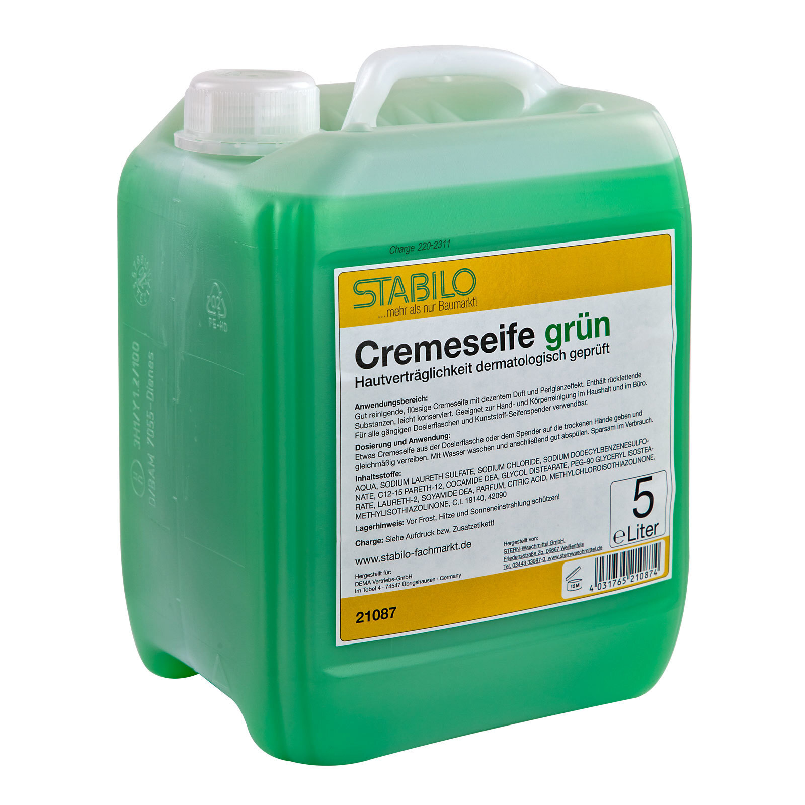 Original Stabilo Cremeseife grün 5 Liter Kanister. Gut reinigende, flüssige Cremeseife mit dezentem Duft und rückfetenden Substanzen. Ideal für Hand- und Körperreinigung im Haushalt und Büro. Sie ist für alle Spender und Dosierer, egal ob Kunststoff oder Metalltank verwendbar.